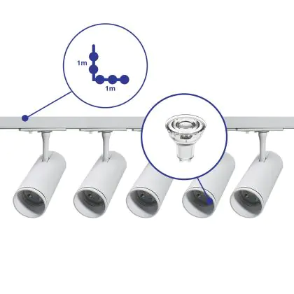 Komplettset 1-Phasen Rail L 1 x 1 Meter Weiß | incl. 5x Spot + GU10 2700K 3W Dimmbar + 1 x 1 Meter Abschlusskappe, Stromanschluss und L -Verbinder