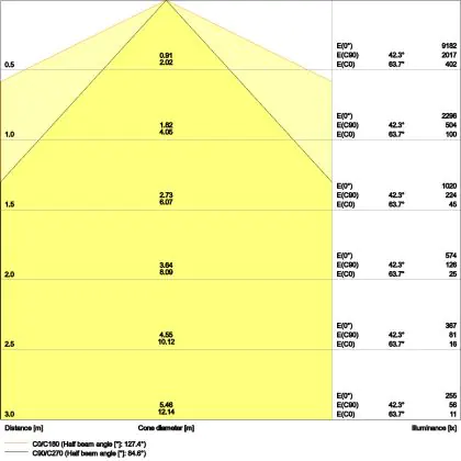 Der Abstrahlwinkel bezeichnet den Winkel, in dem das Licht aus der Lichtquelle ausgestrahlt wird. Er wird in Grad (D) angegeben. Je geringer die Gradzahl des Abstrahlwinkels ist, desto kleiner ist auch der Durchmesser des Lichtkegels, den die Lichtquelle produziert.