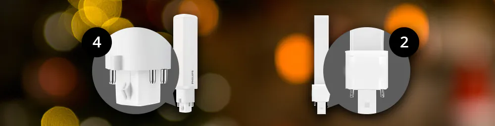 Pour les ampoules basse consommation (LED), il existe des raccords/bases de lampe à 2 ou 4 broches. Choisissez toujours une ampoule à faible consommation d'énergie avec le même culot qu'auparavant, sinon elle ne rentrera pas dans le luminaire et ne fonctionnera pas. Les ampoules basse consommation avec un culot à 2 broches fonctionnent avec un ballast conventionnel (EM), starter inclus. Les amooules basse consommation avec un culot à 4 broches fonctionnent avec un ballast électronique (HF) sans starter.