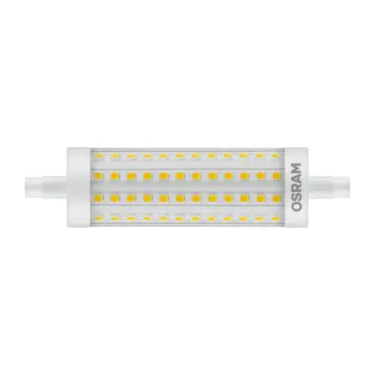 Osram Parathom Line LED R7s 118mm 16W 2000lm - 827 | Dimmable - Remplacement 120W est une ampoule tubulaire linéaire à double extrémité. Ce type d’ampoule permet de délivrer une lumière homogène à 360° avec comme température de couleur 2700K - Blanc Très Chaud. Cette ampoule LED R7s de chez Osram est la solution idéale pour le remplacement de vos anciennes ampoules halogènes. Cette ampoule LED n’a pas besoin de transformateur, elle fonctionne avec 230V et peut se connecter directement sur le secteur électrique.