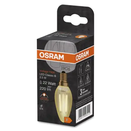 Cette ampoule Osram Vintage 1906 LED E14 Torsadée Bougie Filament Dorée 2.5W 220lm - 824 | Remplacement 25W avec son efficacité lumineuse de lumen par watt vous permettra de profiter d’un éclairage de qualité. Avec sa durée de vie de 15000 heures, vous n’aurez pas à vous soucier de son remplacement avant quelques années.
